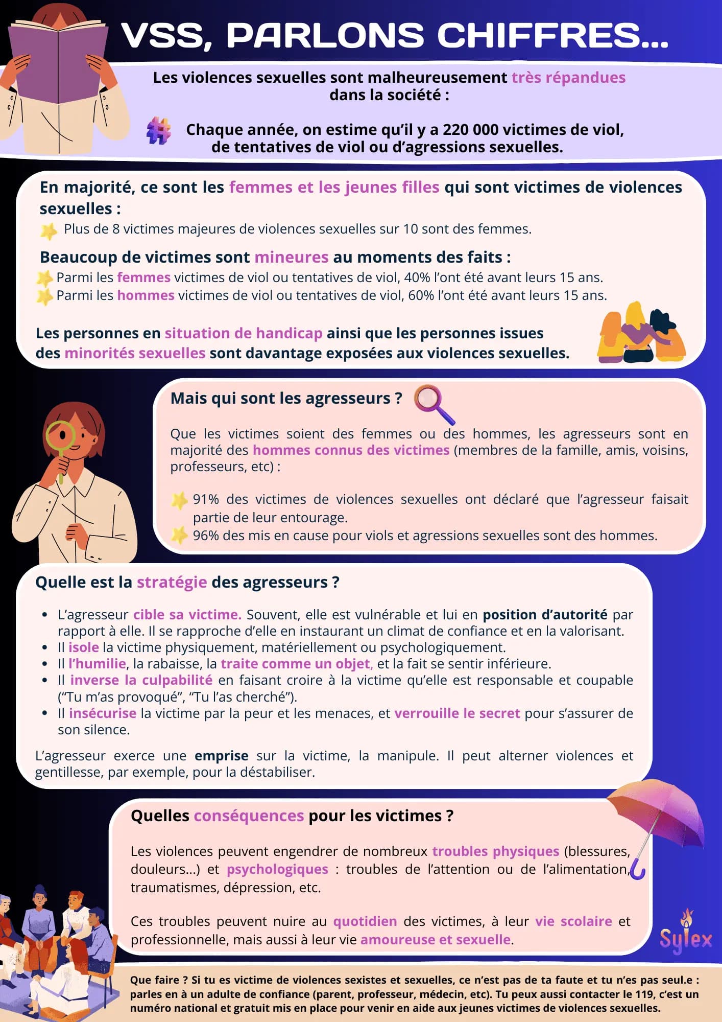 Dans cette infographie, on te présente des statistiques pour mieux saisir l'ampleur des VSS, les profils des agresseurs et des victimes, mais aussi les conséquences des violences sexistes et sexuelles sur les victimes.